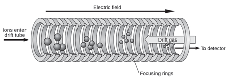 IMS separates ions based on their mobility in the gas phase in a carrier buffer gas and an applied electrical field. The carrier buffer gas flows in opposition to the direction of flight of the ions. Separation is not based on mass-to-charge ratio as it is in mass spectrometry but rather on a combination of the ion’s mass, charge, size, and shape. It is somewhat analogous to electrophoresis in that ions move in response to the applied electrical field but their movement is impeded by the counter-flow of buffer gas. The greater the cross-sectional area of the ion, the greater the number of collisions with the buffer gas and therefore the greater the time it takes the ion to travel a given distance. Stated another way, ions of greater cross-sectional area will arrive at the detector later than those of lesser cross-sectional area. Differences in arrival time is the basis for separation. It is important to note that the ion’s mass and it’s cross-sectional area are not related. Ions of the same mass but of different molecular shape may be separated by IMS. Figure 1 is a schematic of a simple time-of-flight IMS device.