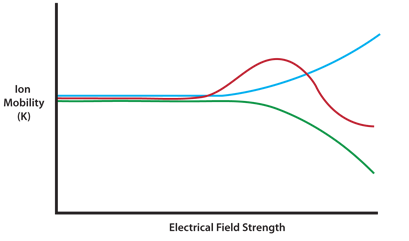 The separation power of IMS can be enhanced by oscillating the applied electrical field from high to low and back again in an asymmetric fashion. This is due to the fact that ions show different K values in high- versus low-potential electrical fields. Oscillating the field therefore refines the selectivity between ions which have similar low-field mobility values (see Figure 2).