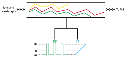 The buffer gas in FAIMS carries ions between two closely spaced electrodes which form the IMS cell. The oscillating electrical field is referred to as the separation or dispersion field (DF). The dispersion field is applied between the cell electrodes and is perpendicular to the gas flow. Ions therefore drift sideways towards one electrode or the other and will eventually crash into the electrode. To counteract this drift a DC compensation field (CF) can be applied which modifies the trajectory of the ions as they pass through the IMS cell. At a particular CF strength only ions of a selected mobility behavior emerge from the end of the cell. The DC compensation voltage can be varied to provide a scanning function similar to that of a transmission quadrupole mass spectrometer, i.e. ions are allowed to pass through the device one-at-a-time based on their mobility behavior. This technique is referred to as Field-Asymmetric Ion Mobility Spectrometry (FAIMS) or Differential Mobility Spectrometry (DMS). Operation of a FAIMS device is shown schematically in Figure 3.