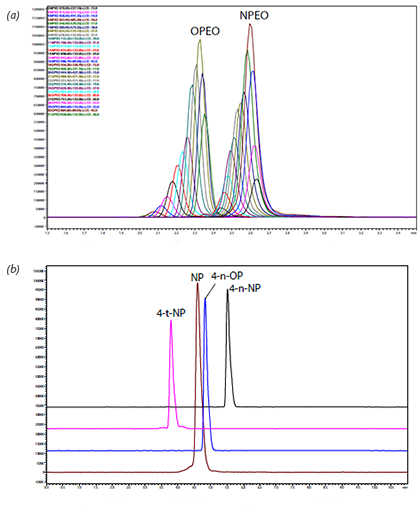MRM Chromatogram of (a) APEO standards (NPEO and OPEO) at 50ng/mL and