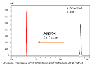Pramipexole is a dopamine agonist drug used to treat Parkinson’s disease. The current pharmacopeias specify the use of gradient elution as a test method. In contrast, ultra-high performance liquid chromatography (UHPLC) is becoming a popular technology in the pharmaceutical field, with improved cost-effectiveness, throughput and analysis time. It is anticipated that revalidation will be required for high-speed UHPLC analysis to be adopted.