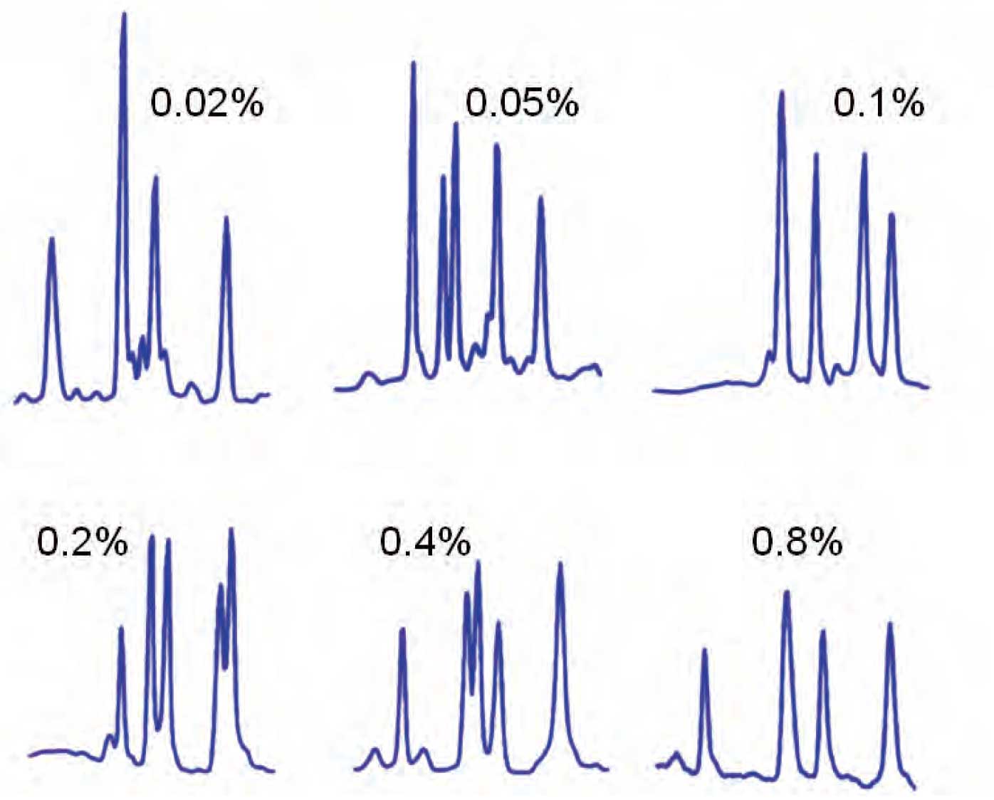 The second case is when TFA is acting as an ion pairing reagent. Whenever ion pairing is used, it is a good idea to keep the ion pairing concentration constant – small changes in the ion pairing reagent concentration can make significant changes in selectivity, as is seen for the various separations in Figure 1. In such cases, it is prudent to add the ion pairing reagent to both A and B.
