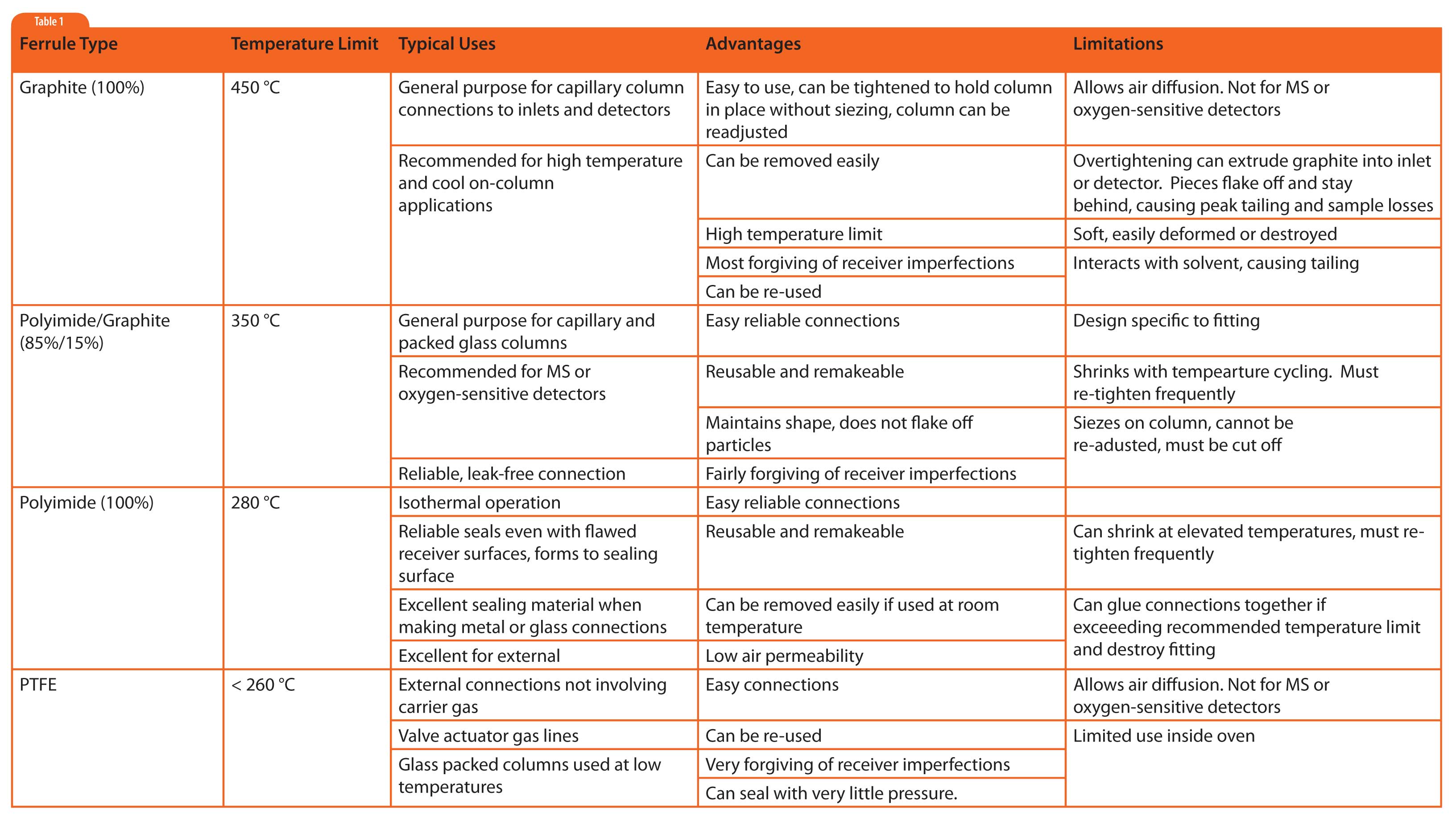 Ferrules of graphite, Vespel® (polyimide), Vespel®-graphite mixtures, and Teflon® (polytetrafluoroethlyene, PTFE) will be discussed. Even though graphite is not a polymer, its characteristics are more similar to the synthetic polymers than metal ferrules discussed last month, so it is included. Attributes of these ferrule materials are summarized in Table 1.