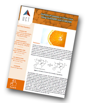 UCT has produced an application note outlining a simple, fast and cost-effective QuEChERS-based method for the determination of limonin in citrus juice. Limonin is extracted from a variety of juice samples using acetonitrile and citrate-buffered salts. The sample undergoes cleanup by dispersive-SPE (dSPE) using primary-secondary amine (PSA), C18 and graphitized carbon black (GCB) to remove unwanted matrix components, including sugars, acids and pigments.