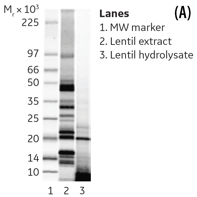 (A) SDS-PAGE analysis of lentil extract, lane 2, and lentil hydrolysate, lane 3.