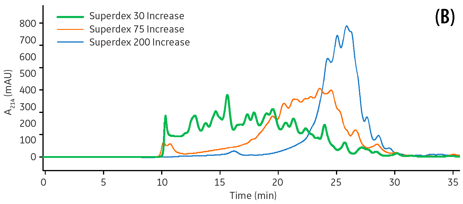 The figure below shows that the hydrolysate was most efficiently separated on Superdex 30 Increase with its smaller fraction range (Mr 100 and 7000). On the other hand, Superdex 75 Increase and Superdex 200 Increase are more suitable for separation of larger molecules such as the proteins extracted from the lentils.