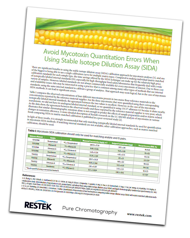 This application note shows how there are significant benefits to using the stable isotope dilution assay (SIDA) calibration approach for mycotoxin analyses — the biggest being able to use a single calibration curve for multiple matrix types.