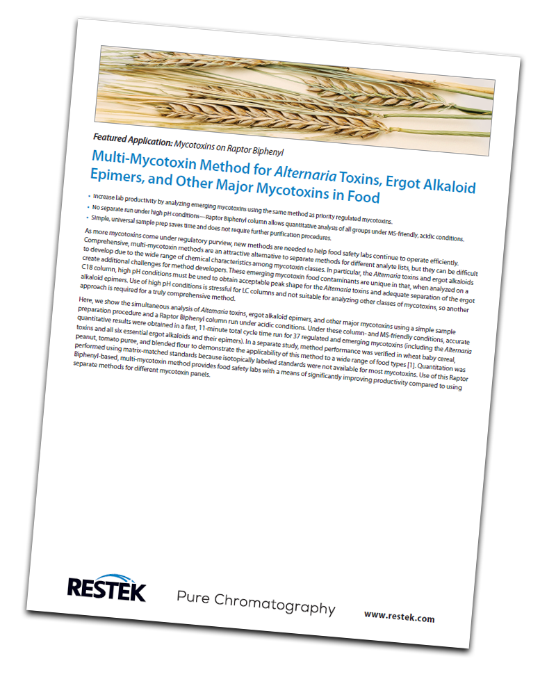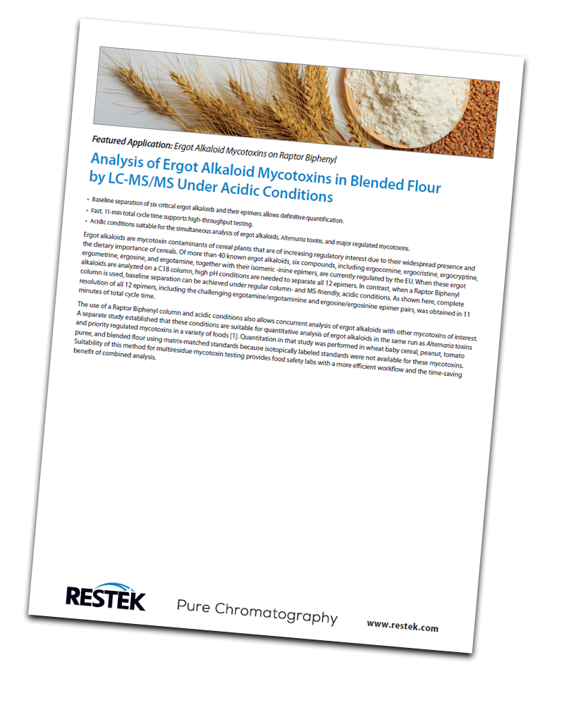 Here, we show the simultaneous analysis of Alternaria toxins, ergot alkaloid epimers, and other major mycotoxins using a simple sample preparation procedure and a Raptor Biphenyl column run under acidic conditions. Under these column- and MS-friendly conditions, accurate quantitative results were obtained in a fast, 11-minute total cycle time run.