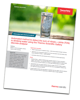 The Thermo Scientific Drinking Water Method: Drinking Water Total Oxidized Nitrogen for the Thermo Scientific Gallery Discrete Analyzer offers laboratories a fully automated approach to compliant nitrate and nitrite testing that minimizes the challenges associated with traditional cadmium reduction methods.
