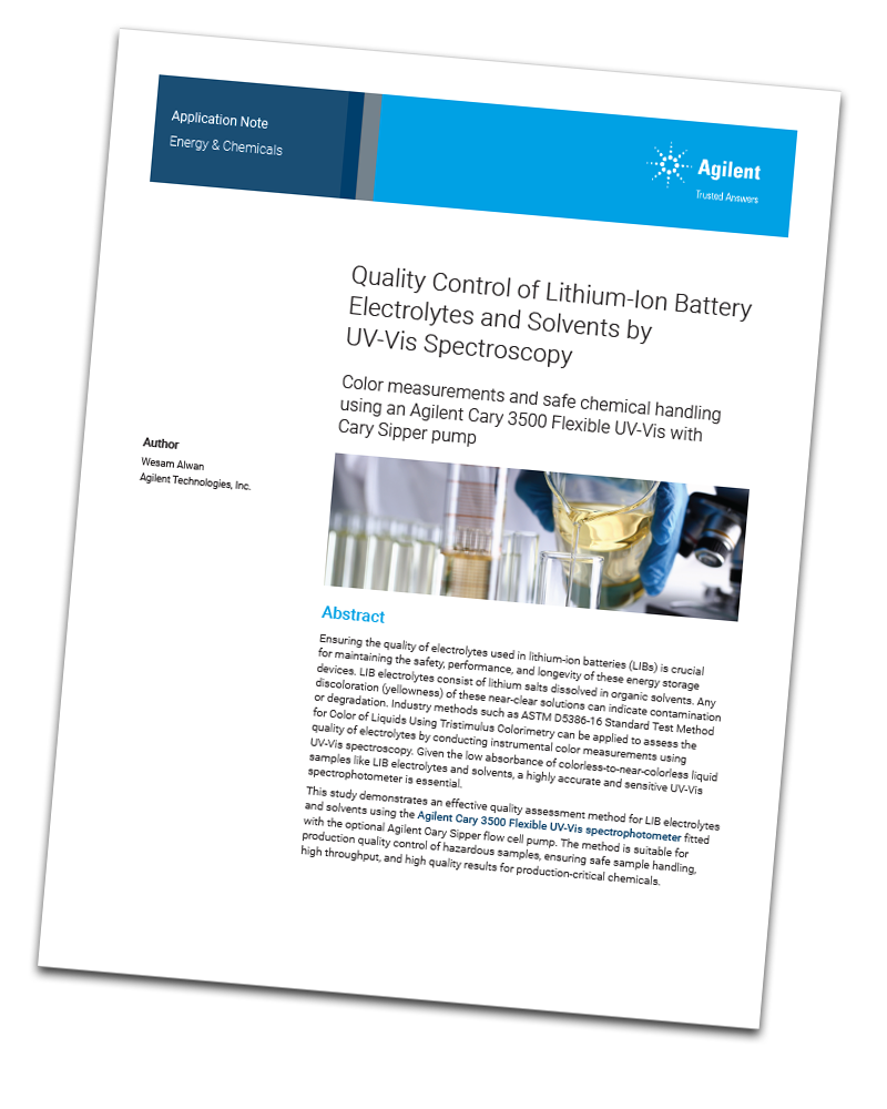 - See how the Agilent Cary 3500 Flexible UV-Vis spectrophotometer provides accurate and precise color measurements for colorless to near-colorless LIB electrolytes and solvents in accordance with the ASTM D5386 standard method.