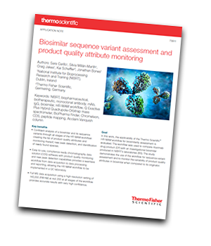In this application note, a Thermo Scientific™ HR-MAM workflow for biosimilarity assessment is evaluated. The study demonstrates the use of the workflow for sequence variant assessment and to monitor the variability of product quality attributes in biosimilar when compared to its originator.