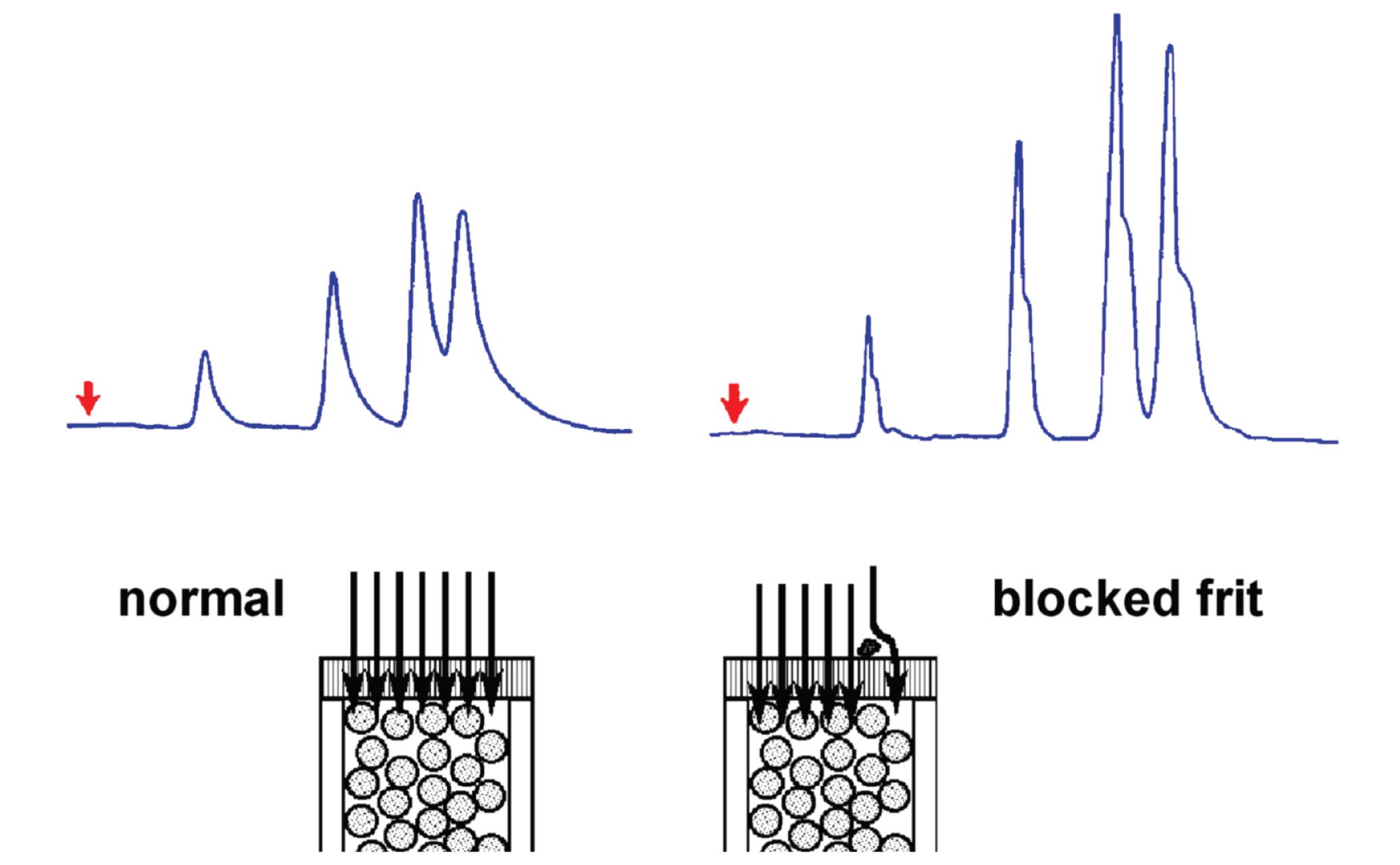 One cause of peak-shape problems for all peaks in a run is shown in cartoon fashion at the bottom of Figure 1. On the left, the sample passes through the frit at the top of the column in parallel streams (arrows), with all sample streams reaching the top of the column at the same time, much like a new showerhead gives a nice, even stream of water. When a partial blockage of the frit occurs, such as is shown on the right, the incoming sample stream is distorted. In this drawing, the sample stream at the far right edge is distorted and gets to the top of the column after the other ones. This means that the sample molecules in this flow stream are effectively injected later than the remaining ones. As no separation has taken place yet (the sample is at the top of the column), some molecules of each sample component lag behind the remaining molecules. And because they start late, they never catch up with the molecules that reach the top of the column first. The later molecules result in a tail at the rear edge of all the peaks in the chromatogram. In extreme cases, all the peaks may be split or doubled. The key feature to identify this problem type is that all peaks in the chromatogram are distorted in the same way, suggesting the problem occurred before any separation took place.