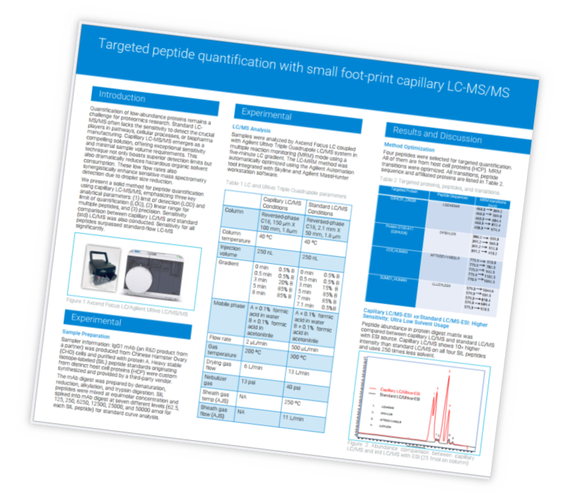 View this Axcend/Agilent poster to learn how a solid method for HCP peptide quantification was developed for the Axcend capillary LC/Ultivo Triple Quadrupole LC/MS System.