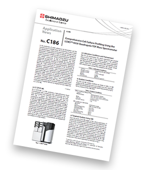 In this article, we demonstrated comprehensive iPS culture media profiling using targeted and non-targeted analysis with the LCMS-9030 Q-TOF. Targeted analysis (selected ion monitoring, SIM) of 27 compounds was conducted readily using the LC-MS/MS Method Package for Cell Culture Profiling to reliably monitor their quantitative changes. Non-targeted (full-scan) analysis was conducted to identify other significant unknowns, and several with quantitative fluctuations were highlighted. With the highly accurate mass information provided, an unknown metabolite of interest was picked for compound estimation using structure estimation software and matched against the Human Metabolome Database. The results suggested that it could be an intermediate metabolite of tryptophan and corresponds to the quantitative results from the SIM analysis.