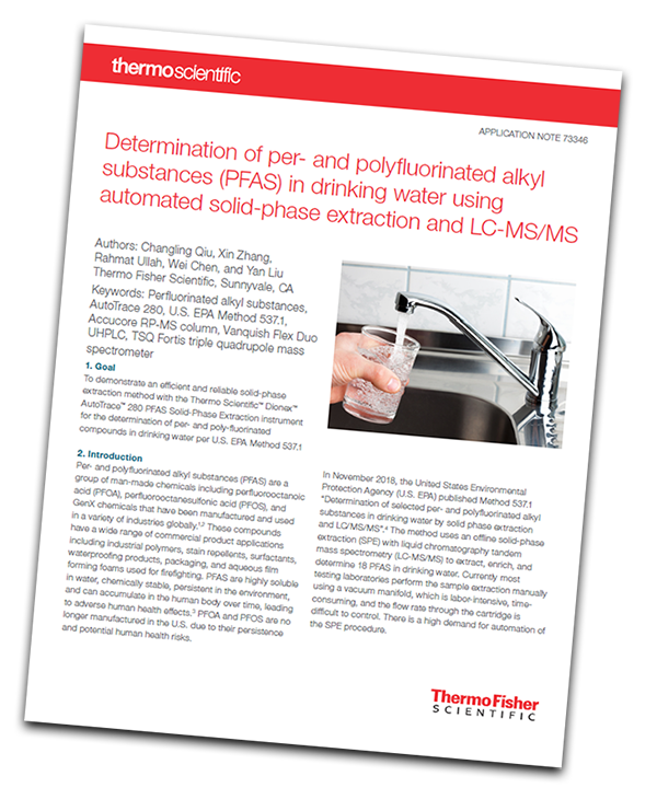 In this application note, we discuss the development of an analytical method using an automated SPE system, AutoTrace 280 PFAS, and LC-MS/MS for determination of eighteen PFAS following the guidelines provided by U.S. EPA Method 537.1. We have demonstrated that the AutoTrace 280 PFAS instrument provides reliable automated SPE for determination of PFAS in large-volume (20 mL–4 L) aqueous samples.
