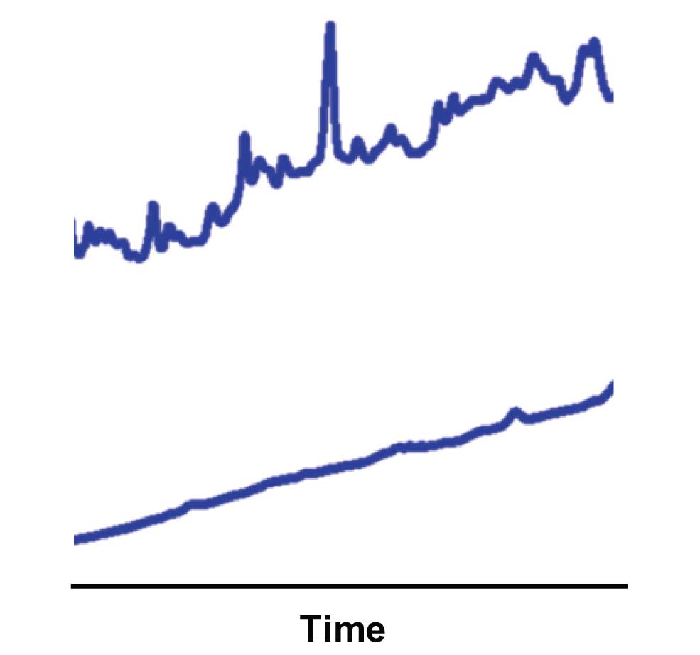 As far as stability of TFA in mobile phase goes, I don’t think there should be much of a problem there. Although TFA is quite volatile as a neat solution, once it is in water, it will ionize and should not evaporate. However, all mobile phases age, and your problem merely may be one of trying to use the mobile phase for too long a time. For example, Figure 1 shows the difference between blank gradient baselines for a freshly prepared buffer (lower) and one that has become contaminated over time (upper). I recommend replacing the aqueous mobile phase once a week. Many workers extend this to two weeks without problems, but again, I say why take the risk? Organics should be good for a month.