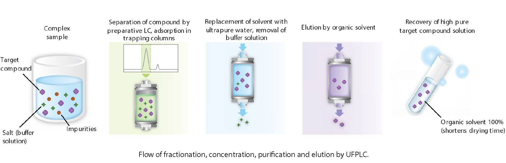 To improve the efficiency of your workflow, Shimadzu introduced the Prominence™ Ultra Fast Preparative and Purification Liquid Chromatograph (UFPLC). It is an automated system containing various trapping columns which facilitates 1) recovery of target compounds, 2) removal of hard-to-volatile solvent and 3) high-purity powderization of fractions.