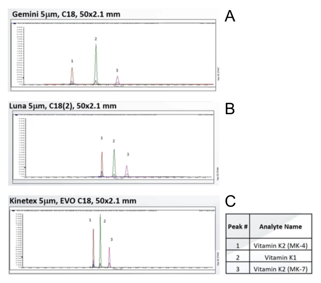 Figure 3: Comparison of two fully porous (A and B) and one core shell (C) HPLC columns for the separation of vitamin K compounds for LC-MS/MS based analysis. Source: Column Selectivity Screening for Vitamin K Compounds (webinar). August 17, 2023. Credit: Phenomenex.