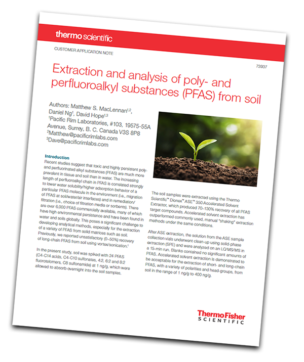 This application note demonstrates how accelerated solvent extraction can extract a variety of PFAS from soil including acids, sulfonates, fluorotelomer sulfonates, and sulfonamide compounds.