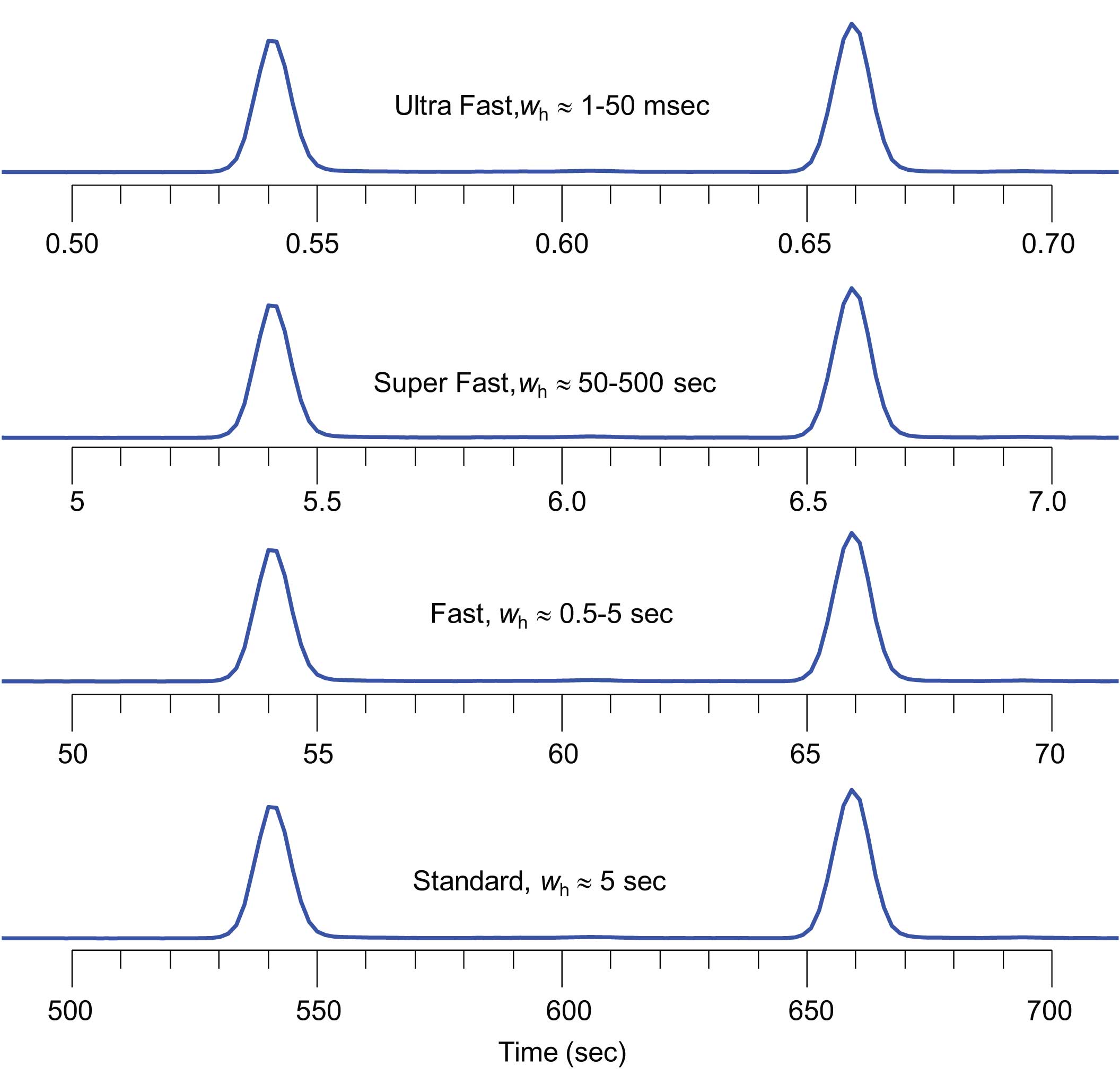 In order to get the most out of GC analysis, one must first define the relevant context of the discussion and measures or “metrics”. Let’s take the topic of Fast GC as an example. What is Fast? Some answer this question from a theoretical slant based on the widths of peaks at half height (wh) (Figure 1). [1,2]