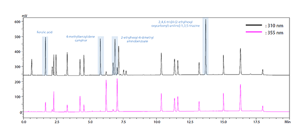 In this article, the high-speed analysis of 23 such UV-absorbents are demonstrated using the Nexera series HPLC system and Shim-pack Velox C18 superficially porous particles (SPP), core shell column. High resolution was achieved in the 20-minute LC run. Commercial cosmetic cream samples were prepared and successfully tested for UV-absorbents using the described LC-UV method and setup.