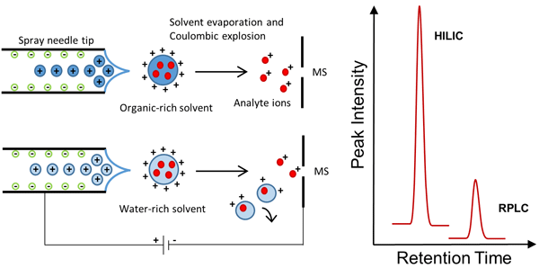 Figure 1: Ion generation in ESI under organic-rich HILIC conditions and under water-rich RPLC conditions. HILIC conditions allow a more efficient desolvation, thus a higher number of gas phase ions enter in the MS with ensuing increase of the sensitivity.