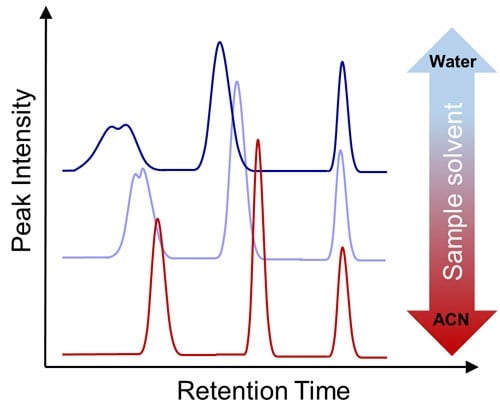 It is good practice in the development of a HPLC method to dissolve the sample in the initial mobile phase or in a miscible weaker solvent. This is even more important in HILIC separation as it is generally more sensitive to the solvent strength mismatch between the sample solvent and the mobile phase in comparison to reversed-phase chromatography.