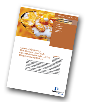 This application note from PerkinElmer details an effective, reliable and robust LC-MS/MS method, using time-managed MRM (Multiple Reaction Monitoring) transitions, for the monitoring of mycotoxins
