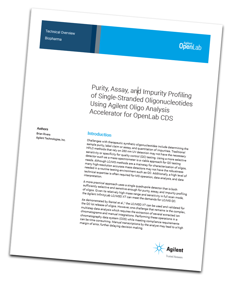 This technical overview will address the Oligo Analysis Accelerator (OAA) for Agilent OpenLab CDS. This software add-on acts as the data analysis front end to OpenLab CDS, leveraging built-in technical controls that help meet data integrity and compliance requirements.