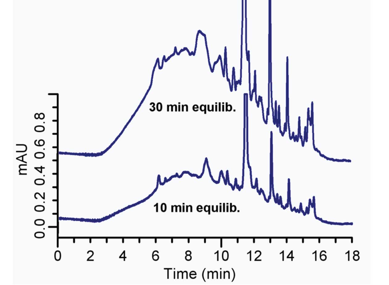 There is a simple test to help confirm that the extra peaks originate from the A-solvent. Simply increase the equilibration time for the run and the peaks in the blank should increase proportionally. In the example of Figure 1, the normal run at the bottom used a 10 min equilibration between runs. In the upper run, the equilibration time was increased to 30 min. This had the effect of collecting three times as much junk at the top of the column before the gradient was run, resulting in peaks that are all three times as big, just as expected. This confirms that the peaks came from the A-solvent.