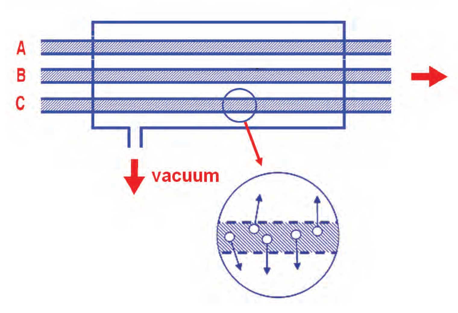 I’ve drawn a conceptual diagram in Figure 1, illustrating the basis of the in-line degassers. Each solvent travels through a piece of porous tubing inside a vacuum chamber (in practice, each tube is in an isolated section). You can think of the tubing as much like the Gore-Tex of your raincoat. It has micropores which allow gas to pass through, but not liquid. In the case of the degasser, the dissolved air from each solvent is drawn through the tubing by the surrounding vacuum, and then to waste. The liquid continues through the degassing tubing to the pump. As you can imagine, the porosity of the tubing plays a critical role in the effectiveness of the degasser. Over the years, different polymer materials have been used with different levels of success. Today’s degassers usually use a thin membrane over which the solvent passes, and the high gas permeability of this membrane makes degassing very efficient.