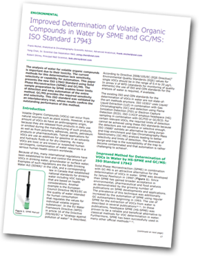 This paper presents the new ISO 17943 Standard using Solid Phase Microextraction (SPME) and GC/MS. The sample preparation by SPME enables lower limits of detection and easy automation of the entire method. GC/MS provides the required sensitivity and selectivity. This ISO standard was validated by an interlaboratory trial, whose results confirm the outstanding performance of this method.
