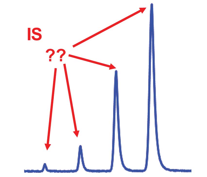 First, we should look at the regulatory issues. When LC-MS (or LC-MS/MS) is used, the IS often is a stable-labelled, or isotopically labeled, version of the analyte, with several 13C or 2H substitutions. It is rare that a stable-labelled compound is 100% pure; rather it contains some unlabelled analyte, and you don’t want to mistakenly quantify this contaminant and attribute it to analyte from the sample. For this reason, the IS peak cannot have more than 5% of the unlabelled analyte present.