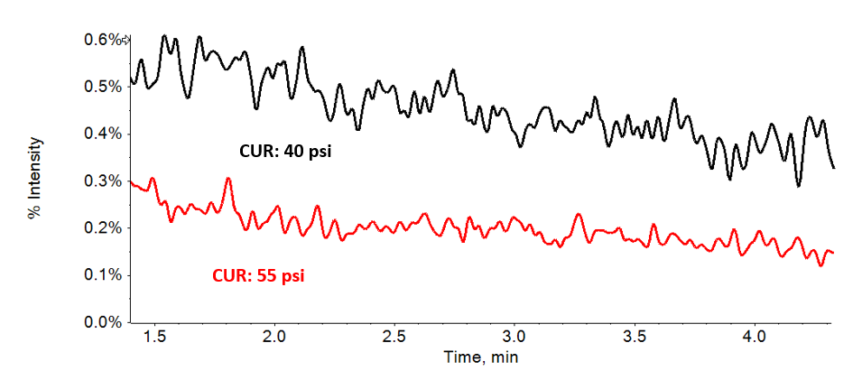 In addition to the DP or Q0D parameter, it is important to optimize the curtain gas (CUR), measured in psi. Curtain gas is a flow of nitrogen, which is blown out of the orifice of the system to reduce system contamination. Higher values can reduce background and improve LOQ values. Figure 2 highlights this reduction.
