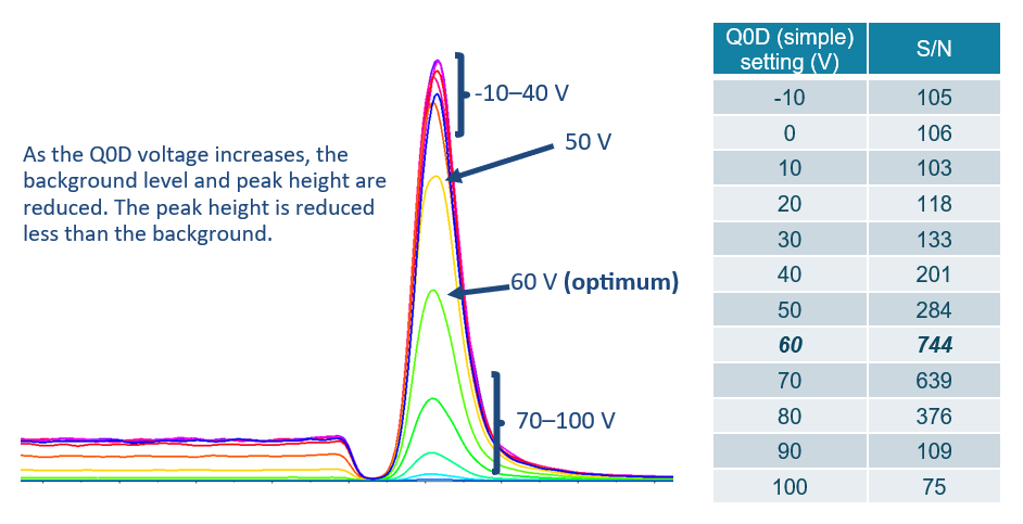 Most importantly, the declustering potential (DP) or Q0 dissociation (Q0D) parameters, which are both measured in volts, must be optimized. Q0D works by applying a voltage between the QJET and IQ0 lens of the system and can be used to reduce interferences. Note that the Q0D parameter is only relevant on select systems, whereas most use the DP parameter. Typically, the optimization of both parameters would be performed by syringe infusion. However, this method tends to provide incorrect optimization values, as it does not account for the background observed when performing LC-MS analysis. As such, because these parameters have a large impact on the background observed, it should be optimized through LC-MS rather than syringe infusion. LC-MS optimization can be performed in a single injection by analyzing the same MRM transition with differing Q0D values. Figure 1 highlights this phenomenon.