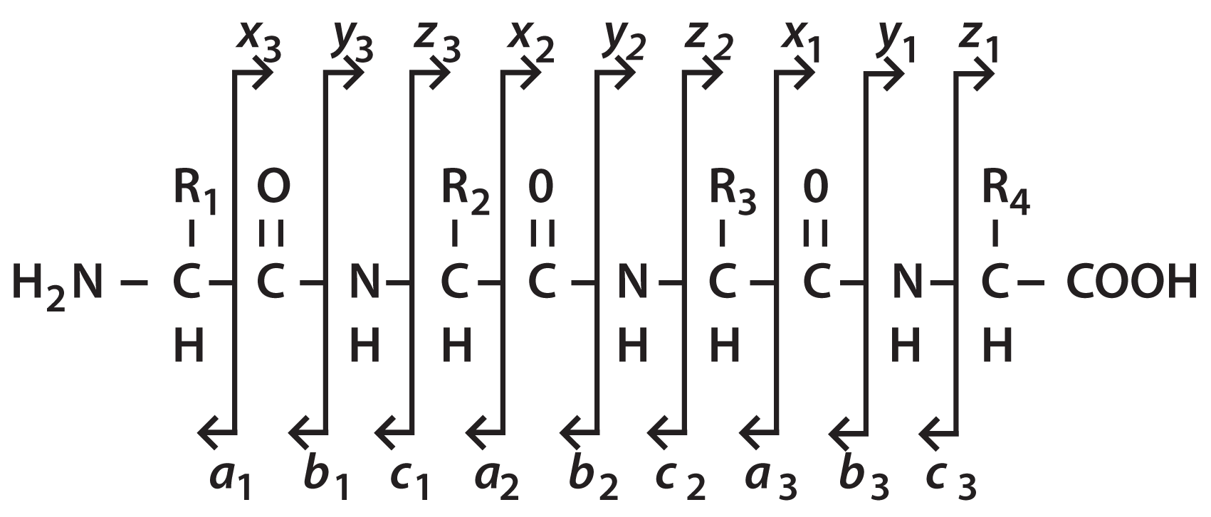 Figure 1 shows the nomenclature which has been adopted for naming the ions formed from peptide backbone cleavages. The vertical lines show the bond cleavage and the arrows point to the product ion, the remaining portion of the precursor being the neutral loss. The product ions are referred to by the letters a, b, c and x, y, z . The a, b, c series of ions refer to the charge remaining with the N-terminal portion of the peptide ion while the portion containing the C-terminus is the neutral loss. Peptide sequences are, by convention, listed from the N- to the C-terminus, therefore the choice of the a, b, c nomenclature is pneumonic as these are the first three letters of the alphabet. Similarly, the x, y, z ions are those product ions in which the charge is retained on the C-terminal portion of the ion.