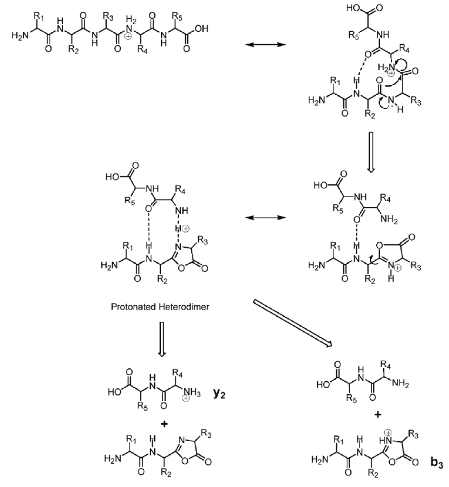 Figure 3 shows a mechanism for formation of both b and y ions from the same bond cleavage. Under CAD conditions, electrons move in response to the charge resulting in cleavage of the peptide bond proximal to the charge, i.e., between residues 3 and 4. The intermediate species in this reaction is a heterodimer as illustrated in the figure. There is some probability of the proton adducting to either the residue 3 or residue 4 amide nitrogen. Thus two fragment ions are probable, i.e., both a y 2 and a b 3 ion. The structure of these two ions is shown along with their corresponding neutral losses.