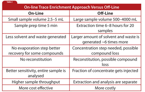 If we compare off-line SPE with on-line SPE for water analysis of emerging contaminants like PPCP (pharmaceuticals, personal care products), where the on-line SPE valve is attached directly to the MS/MS, we can see many advantages to using on-line SPE (Table 2).