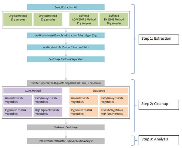 Figure 2: Generic QuEChERS method protocol highlighting step 1: extraction, step 2: dSPE clean up and step 3: analysis by LC/MS and GC/MS.