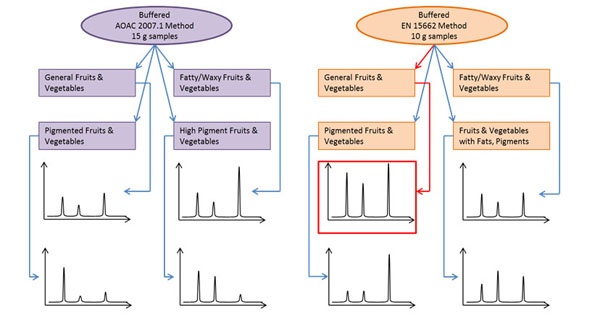 The easiest and simplest route to take in method development is to screen a combination of commercially available pre-weighed QuEChERS kits in a ‘mix-and-match’ fashion as shown in Figure 3. To calculate the number of samples required for your method optimization, use the following formula: number of extraction kits × number of dSPE types for clean up = total number of samples. In this example, if you chose to use the EN and AOAC extraction kits with four different dSPE tubes for each extraction there are a total of eight samples, which you can prepare within 10 to 20 min. If your analytical run time is 20 min, then you’d need 160 min to complete your analysis. In about three hours of lab time you will get an idea of which combination of extraction salts and dSPE sorbents will perform the best by comparing the chromatograms from the eight samples. Once the right combination of extraction and dSPE kits are chosen you can modify your method even further to improve the results if you desire. In the hypothetical example shown in Figure 3, buffered EN extraction and general fruits and vegetables dSPE give the best chromatographic signal responses and would, therefore, be the best combination to use.