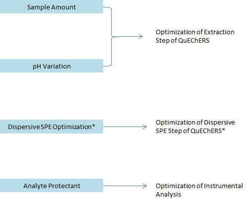Figure 4: Variables to consider in QuEChERS method optimization (*Dispersive SPE optimization using bulk sorbent materials is optional and is not discussed here.)