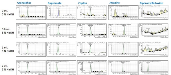 Another consideration is pH variation. Sometimes you may not have enough information for your sample. Let’s revisit the case of juice concentrate samples with an unknown concentration factor. You may need more information for the juice concentrates, such as whether they contain peel from the fruit when they were prepared, what the concentration factor is, and what the pH level is. If it is too concentrated and the texture of the juice concentrate is extremely thick, it will not be easy to measure the correct pH level of the sample. For base-sensitive pesticides there have been many trials to improve the recovery of these analytes [10]. On the other hand, if your sample matrix is extremely acidic, your compounds of interest may not be extracted efficiently and your results may not meet the acceptance criteria set for validation. Once you select the sample amount mentioned above, use that amount and test different pH levels during the extraction. In the case of juice concentrates, you may add 0, 0.6, 1, and 2 mL of 5 N NaOH to give different pH environments and determine any enhancement in method performance. Some compounds show dramatic improvements, as seen in Figure 5.
