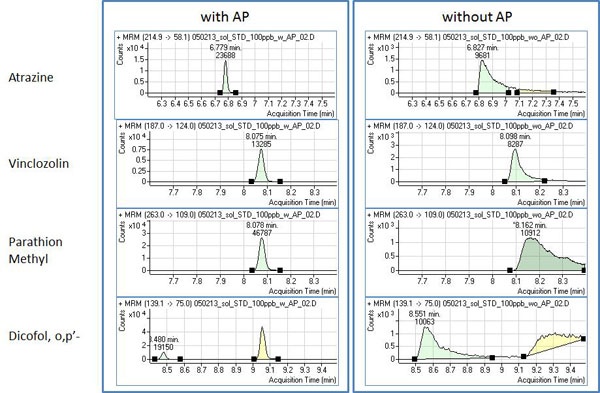 Figure 6: Chromatograms demonstrating the performance differences for analytes using GC/MS/MS with and without APs in lemon juice concentrate.