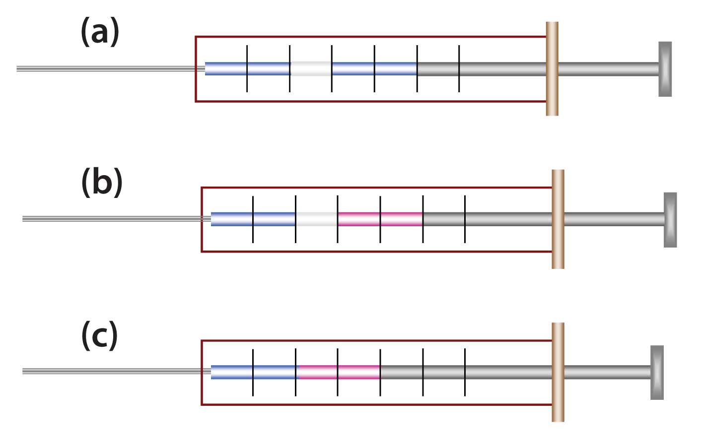 Figure 1: Comparison of some sandwich techniques. (a) Solvent is placed into syringe first, followed by air and then sample. The intent is that the solvent will rinse surfaces and ensure total sample transfer. (b) A different solvent or derivatization reagent is used, separated by air plug. (b) Chasing solvent or reagent in direct contact with sample.