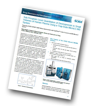 In this study, a successful micro LC-MS/MS method for the highly sensitive quantitation of desmopressin in human plasma is demonstrated. It shows how the QTRAP® 6500+ LC MS/MS system with OptiFlow™ Source coupled with a M5 MicroLC system provides reliable quantitation with high reproducibility, high throughput and minimum source optimization requirements.