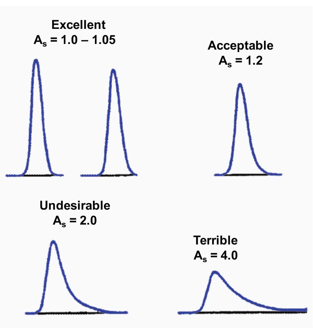 A new column may exhibit a little peak tailing or fronting. Many manufacturers have column-release specifications from their quality control (QC) program that allow tailing of 0.9-1.2. This means that the peak may front or tail a bit and be perfectly OK. Such peaks are represented by the two examples at the top of Figure 1.