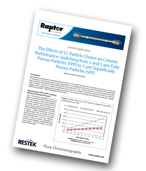 Raptor™ 5 μm LC columns with superficially porous particles (SPP) display lower backpressure and increased efficiency when compared to columns packed with 3 and 5 μm fully porous particles (FPP) of similar dimension. When used in the development of new assays, Raptor™ 5 μm SPP LC columns offer fast run times and excellent method performance without upgrading instrumentation. When substituted into existing methodologies, switching from conventional 3 μm and 5 μm FPP columns to Raptor™ 5 μm SPP LC columns has the potential to dramatically decrease analysis times while improving efficiency and sensitivity. Certain assays may require some degree of method development to achieve optimal results, but Raptor™ 5 μm LC columns are compatible with most assays and offer an excellent way to increase performance without extra cost or labour.