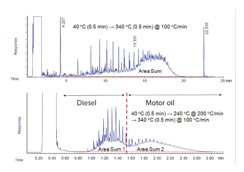 TPH analysis is even simpler. The goal in TPH is simply to estimate the total hydrocarbons present by using either a single sum of the total response, or by dividing area response into two categories (low end = diesel range and high end = motor oil range), as shown in Figure 2. TPH analysis is commonly used to monitor the leach rate and direction of leaks from underground storage tanks. In both the simulated distillation and TPH examples, very fast temperature ramping has been shown to yield comparable results to the more traditional ramp rates. But still, even though faster than conventional oven ramp rates, the fastest possible rates are not used.