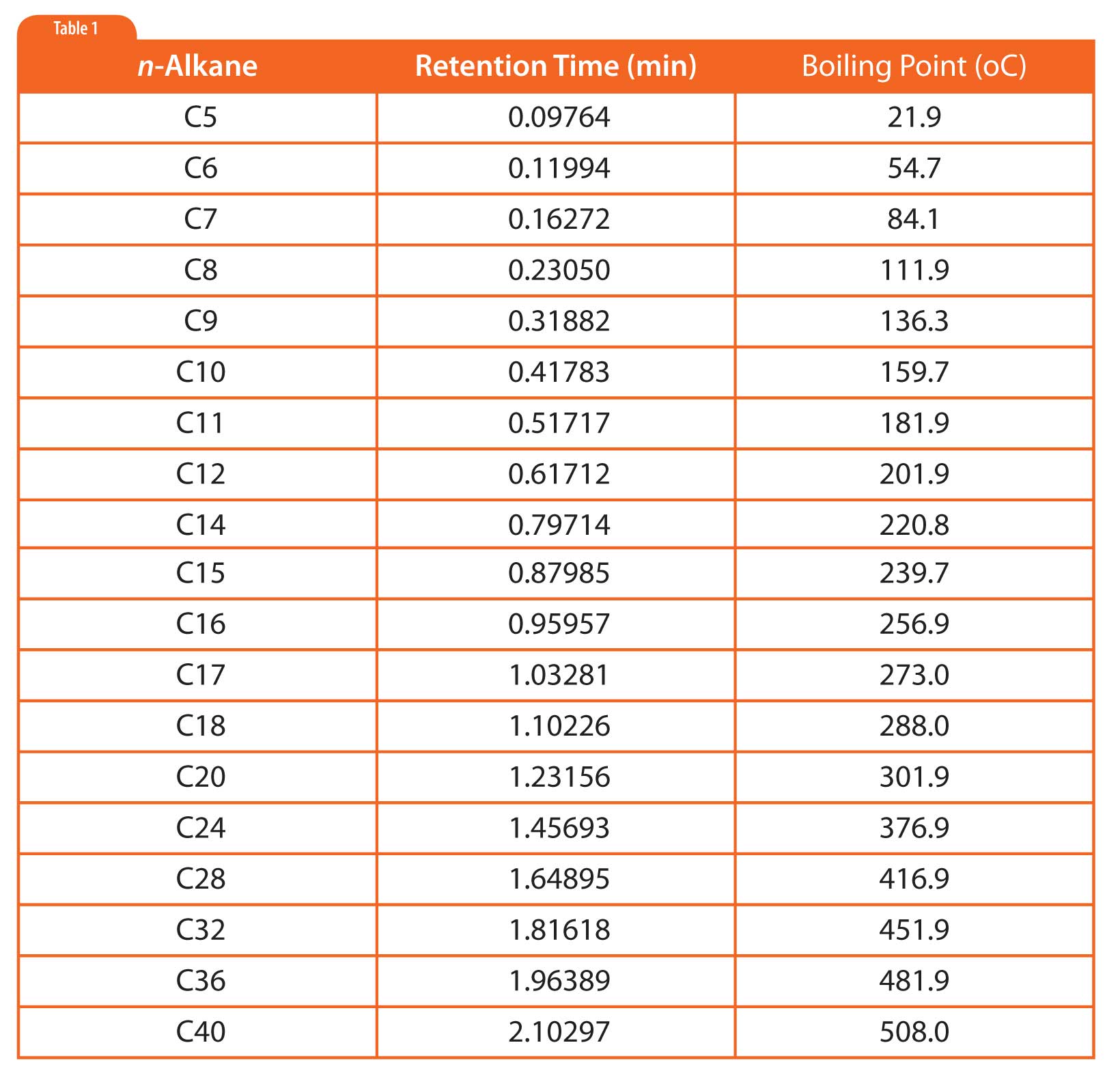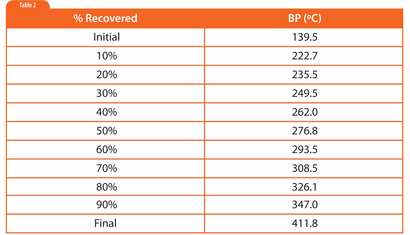 In simulated distillation (used in oil refining), one generates a boiling point versus retention time calibration based on normal alkanes as shown in Figure 1 and Table 1 (5). Then one uses area-percent slices of the sample chromatogram to determine the boiling point at which given percentages of the sample had eluted, as shown in Table 2. There is no need for or interest in separating individual components.