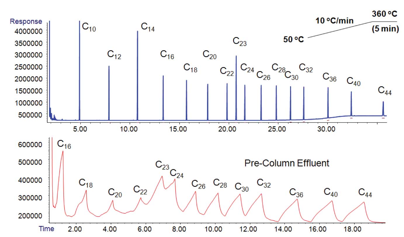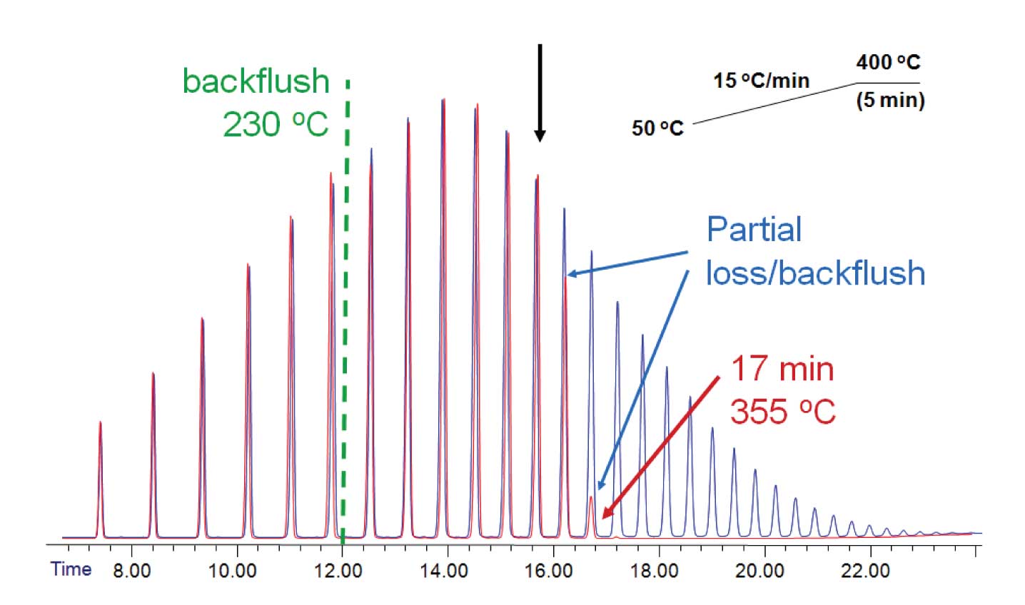 Looking at Figure 2 more carefully, one can see that the earliest discernable retained peak is n-C16. Uncoated pre-columns are certainly not the best choice for samples of volatile compounds; a coated pre-column or post-column backflush configuration would be better choices. In general, one can see that the compounds in this example elute approximately 150 °C earlier than they elute from the analytical column. Elution temperature differential is a function of phase ratio of the analytical column (thicker films, lower phase ratio increases the differential) and reduced ramp rate (higher °C/tM increases the differential)[1].